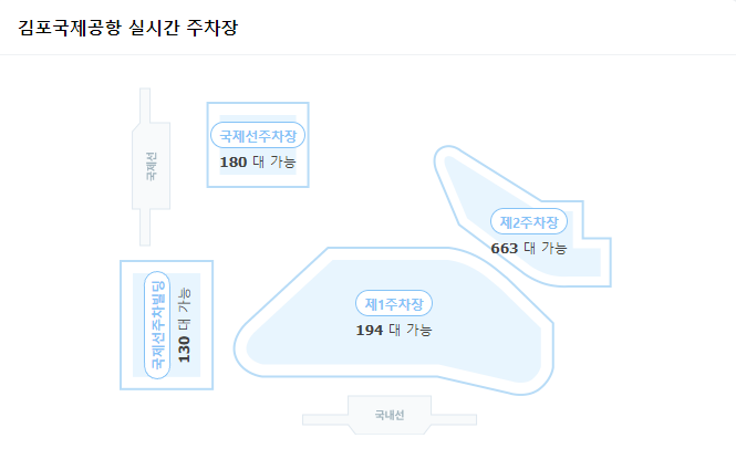 자리가 있다면 가장 마음 편하게 주차할 수 있는 곳이 국내선 주차장입니다. 김포공항 국내선 제1주차장과 제2주차장은 실시간 현황을 업데이트해 주니 자리 여유가 있는지 확인이 가능합니다. 약 800여 대의 주차가 가능하고 평일은 비교적 주차가 수월한 편인것 같습니다.