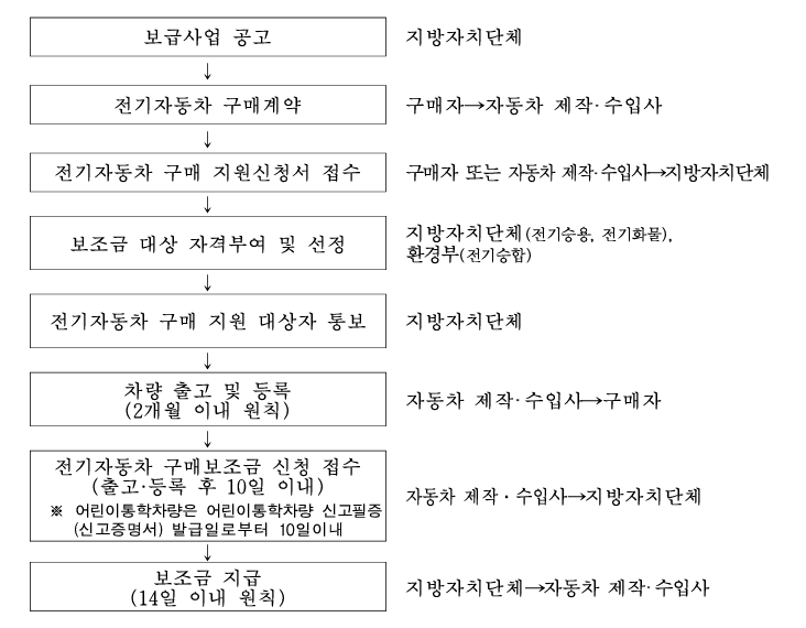 - 개인, 법인, 공공기관, 지방자치단체, 지방공기업 등이 전기자동차 보조금 지원 대상 자동차를 신규구매하여 국내에 신규등록하는 경우 (자동차 등록말소 이력이 있는 차량은 보조금 지급 대상에서 제외)